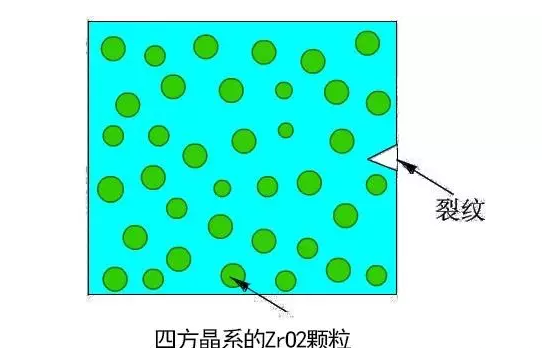 四方相氧化鋯受外力(溫度和應(yīng)力)的影響,氧化鋯從四方結(jié)構(gòu)向單斜結(jié)構(gòu)轉(zhuǎn)變時(shí)產(chǎn)生效應(yīng),吸收破壞的能量,抑制裂紋的變化和延伸。此變化稱為馬氏體轉(zhuǎn)變??煞譃闊衫鋮s過(guò)程中相變和使用過(guò)程中相變,前者是溫度誘導(dǎo),后者是應(yīng)力誘導(dǎo)。