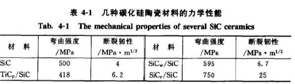 ⑤制備工藝的簡(jiǎn)化。幾種碳化硅陶瓷材料的力學(xué)性能見(jiàn)表4-1。