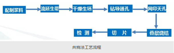 共燒法分為高溫共燒和低溫共燒。兩者工藝流程基本相同,首先將陶瓷粉體與有機(jī)粘接劑混合形成漿料,再利用刮刀把漿料加工成片狀,經(jīng)干燥后形成陶瓷生坯,然后根據(jù)設(shè)計(jì)要求在生坯上加工導(dǎo)通孔并填充金屬粉末,利用絲網(wǎng)印刷技術(shù)在生坯表面涂布形成線路圖形,最后將各層生坯層疊后進(jìn)行壓合,在共燒爐內(nèi)完成燒結(jié)并成型。具體如下: