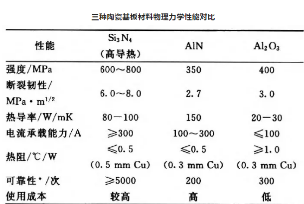 此外,氮化硅的線膨脹系數(shù)與Si、SiC和GaAs等半導體材料匹配良好,這使氮化硅陶瓷成為一種極具有吸引力的高強高導熱電子器件基板材料。氮化硅、氮化鋁及氧化鋁陶瓷的力學性能對比見下表。