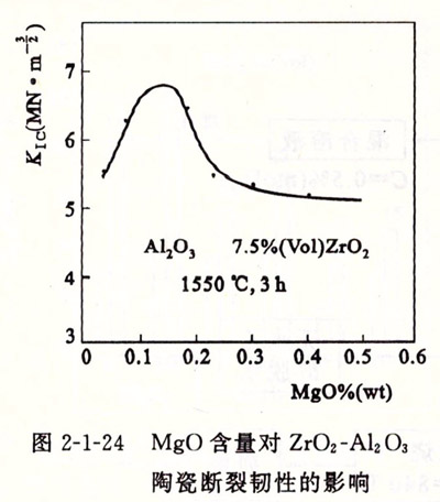 為了進一步改善增韌效果,適當引入其他物質(zhì),形成固溶體,例如引入Mg0、Al。()。、【:c()及Hfoz等。當氧化鋯中含有0.12%(mol) Mg0時,ZTA陶瓷的斷裂韌性(KIc)有最大值。如圖2-1-24所示。引入Alz Oa,可以抑制氧化鋯晶粒長大。又如引入Hfoz,由于Hf07具有和氧化鋯類似的結構和特性,而且由于它比氧化鋯具有更高的M,(相轉(zhuǎn)變溫度)和A,(逆相變終止溫度),同時還具有比氧化鋯低的熱膨脹系數(shù)和相變 t-氧化鋯一m-氧化鋯體積效應。因此Hf02有較高的耐高溫性能和抗熱震性。另一方面,由于Hf02高的姚溫度, t-氧化鋯向m-氧化鋯的相變驅(qū)動力大,相變的臨界顆粒尺寸也小,所以在冷卻過程中,很難保存足夠的t-氧化鋯,這對相變增韌是有利的。但當Hf02-氧化鋯固溶體中引入少量Y2 0a和采用特殊工藝手段,可以使Y2 0a -Hf02 -氧化鋯固溶體獲得較高的t-氧化鋯,具有良好的增韌增強效果,同時可以改善ZTA陶瓷的高溫性能。