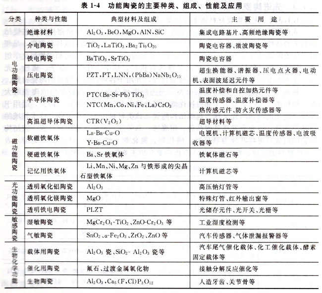 功能陶瓷是指以非力學性能(如電、磁、熱、化學、生物等性能)為主的陶瓷磚B=有些陶瓷材料既是結(jié)構(gòu)材料也是功能材料,如2r02、A12 03、SiC等。功能陶瓷制品具有品種多、應用廣、更換頻繁、體積小、附加值高等特點,主要有金屬氧化物和Ba、Pb、Mg及Sr的鈦酸鹽等,表1-4簡要介紹幾種主要功能陶瓷。
